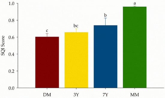 The differences between the means of the soil parameters (i.e., SOC, pH, available P, and BD), SQ indicators, and SQI in the study plots (i.e., DM, 3Y, 7Y, and MM) were tested using analysis of variance (ANOVA). When significant, the means were compared using Tukey’s test (p < 0.05).
