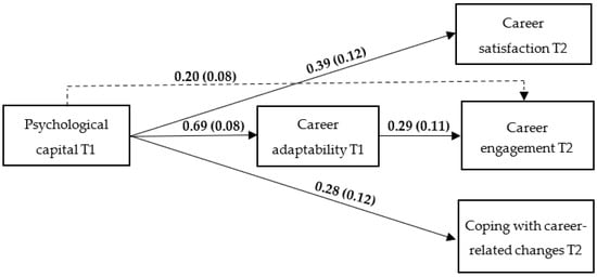 Resulting Relationships Between Study Variables. N = 305. Only significant paths are displayed. Results show standardized estimates and standard errors in parentheses. The dashed line represents the indirect effect via career adaptability.