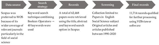 The time span for the search was from 1990 to 2020. The three-decade period was selected to allow for nuances in the publication trend. Using the title, abstract and keyword search options within Scopus, a total of 62,648 social science publications were retrieved. The records were then limited to only original articles, papers published in English and selected journals, using a manual process. The filtering brought down the number of papers to 11,714, which were used for the analysis. The language screening was important to ensure that all articles could be analysed without difficulty. However, we acknowledge that this is likely to have eliminated some important papers published in other languages. Figure 1 shows the process.