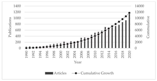 Bibliometric analysis is widely applied across different disciplines, because it provides valuable information about scientific fields [28]. At its heart are statistical techniques used to objectively examine and quantify the number and growth trend of publications in an academic discipline [29,30]. Bibliometric analysis makes it possible to provide a macroscopic overview of a large amount of literature, through characterisation of various attributes, such as publication record, growth and impact [31,32] and it allows assessment of scientific quality and knowledge impact in a particular research domain [33]. It has been applied to study many fields in different contexts, including sustainability science [34], smart cities [35], city systems [36], funding and research productivity [37], safety culture [38] and deforestation [39].
