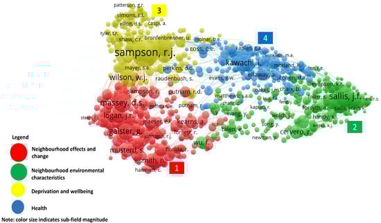 With respect to what the authors investigated, Galster [61], Kearns and Parkinson [18], among others, have extensively analysed how the immediate neighbourhood socioeconomic, cultural and political factors influence life changes. Sallies and others and Cervero [62] analysed neighbourhood environment and physical activity correlates in 11 countries; Wilson and Taub [63] discussed race, ethnicity and class tensions in Chicago neighbourhoods [5,64], on the other hand, employed various techniques to study neighbourhood health in different contexts. A closer look at Figure 2 shows that it is consistent with Table 3, as almost all the lead names in each cluster are among the most productive authors. However, it is important to note that the node size can be influenced by the relative size of a subfield. This is important because journals, for instance, in urban environments and psychology-related disciplines tend to have higher citation indexes than those, for instance, in urban anthropology because there are more scholars in the former fields.