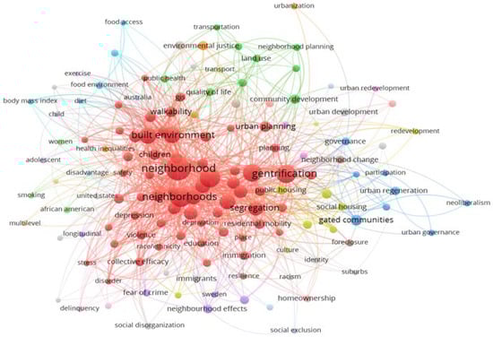 The analysis of the cooccurrence of titles, keywords and abstract terms of neighbourhood research provides critical insight into the core topics, concepts and research trajectory of this field of study (Figure 5). The bigger the node size, the higher the occurrence of a term in the documents while the edge between terms gives an indication of closeness, so that a shorter edge suggests a stronger relationship [38]. The various colours—red, green, blue, yellow, grey, gold, violet, brown and sky blue, highlight eight clusters. For instance, in the red cluster (largest), noticeable keywords such as gentrification, neighbourhood/s, built environment and segregation, suggest a focus on urban geography and sociological issues. Cluster blue keywords, such as governance, neoliberalism and participation, suggest urban governance. The keywords in the gold cluster (e.g., redevelopment and social housing) represent a neighbourhood housing focus. Frequently occurring words, such as fear of crime, neighbourhood effects, racism and exclusion, found in grey, violet and brown clusters, suggests a focus on neighbourhood social conditions and adverse neighbourhood outcomes. The keywords in the green cluster (e.g., land use, community development and transportation), suggest a neighbourhood planning concern. Food, environment, exercise, quality of life and health inequalities, suggest a concern with the relationship between nutrition and wellbeing and the physical environment, i.e., neighbourhood health effects. Also worthy of mention are some core keywords in the red cluster (i.e., neighbourhood/s, collective efficacy, place, deprivation, residential mobility and walkability), which are perhaps more indicative of a more conceptual focus.