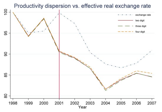 where is the trade value share of country in total trade with China in industry during year . is the total trade value, i.e., exports plus imports. Therefore, the real effective exchange rate of the industry in year t is the weighted average of the relative real exchange rate, weighted with trade share of country with China in the last year. Figure 1 shows the relationship between the productivity dispersion and the effective real exchange rate.