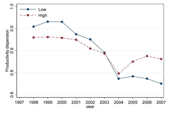 The change of productivity dispersion overtime for the high and low-pollution industries is shown in Figure 2. Figure 2 shows that the productivity dispersion of the low-pollution industry is higher than that of the high-pollution industry before 2003, and the productivity dispersion of the low-pollution industry is lower than that of the high-pollution industry after 2003.
