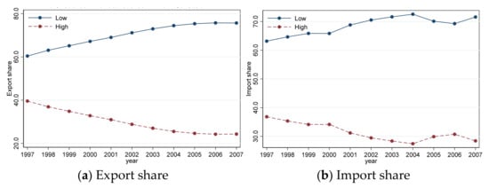 Figure 3 shows the share of exports and imports of high and low-pollution industries in the value of trade, i.e., the percentage of exports and imports of high and low-pollution industries, respectively, in the total value of exports and imports. Figure 3a,b indicate that in terms of export and import value, low-pollution industries are higher than high-pollution industries, and the gap is evident over time. Therefore, for the Chinese manufacturing industry, the trade of products from low-pollution industries plays a dominant role, with more than 70% of both export and import values in 2007.