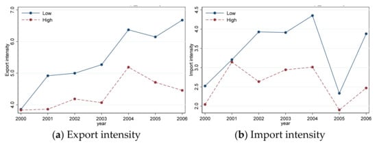 For exchange-rate shocks, the differences between export intensity, import intensity, and import penetration within an industry are crucial in explaining the efficiency of resource allocation within the industry. Industry export intensity is defined as the ratio of industry exports to total output. Industry import intensity is defined as the ratio of the value of industry imports of intermediate goods to industry input costs, where input costs are the sum of intermediate inputs and employee wages. Industry import penetration is the ratio of the value of final goods imported by the industry to the value of domestic sales of the industry. The average values of export intensity and import intensity of high and low-pollution industries are shown in Figure 4. It is shown from Figure 4 that the export intensity and import intensity of low-pollution industries are higher than those of high-pollution industries. There is an increasing trend for all industries over time for export intensity.