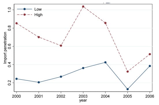 The change of industry import intensity over time fluctuates obviously. The change of the average value of industry import penetration over time is shown in Figure 4, and it is shown that the import penetration of high-pollution industries is higher than that of low-pollution industries, which implies that exchange-rate appreciation may make the market competition of products within the high-pollution industry fiercer than that of the low-pollution industry. Figure 5 represents the net exposure of the industry, which is the industry average, by subtracting the import intensity from the export intensity of the industry. It is seen from Figure 5 that the net trade intensity tends to increase over time, and there is no significant difference in the mean values of net trade exposure between high and low-pollution industries.