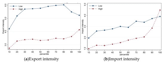 The companies with labor productivity below 10% are marked as ten quantile groups. The companies with labor productivity quantile above 10% but below 20% are marked as 20 quantile groups. The companies with labor productivity quantile above 90% are marked as 100 quantile groups. The export intensity of a company is defined as the ratio of the value of the company’s exports to the value of the company’s total output. Import intensity is defined as the ratio of the intermediate inputs imported by the company to the total input cost of the company, which is the sum of the value of inputs and employee wages. Then the export and import intensities of each company within a group in the industry are summed to obtain that group’s export and import intensities. Each group’s export and import intensities are averaged over the years as a measure of the export and import intensities of each group, and the results are shown in Figure 6.