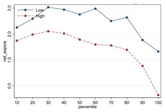 In terms of export intensity, the export intensity of low-pollution industries is higher than that of high-pollution industries at different productivity levels. The relationship between export intensity and productivity in low-pollution industries shows an inverted-U-shaped trend. In contrast, the relationship between export intensity and productivity in high-pollution industries is positive, and the higher the productivity, the higher the export intensity. For a net exporter, appreciation negatively affects both ends of the productivity distribution of low-pollution industries less than those in the middle. In contrast, the negative effect for high-productivity industries is more remarkable for higher-productivity companies, while low-productivity companies may not be significant. As for the import intensity, the import intensity of low-pollution industries is higher than that of high-pollution industries except for the 100 quantile group. Import intensity increases with increasing productivity for all industries. It is shown by comparing import intensities at different productivities within the same industry. There is a more noticeable difference in import intensities between the ten quantile group and the 100 quantile group for the high-pollution industries than those for the low-pollution industries. Suppose the decrease in the import price of intermediate goods favors increased productivity. In that case, the increasing difference in import intensity between high- and low-productivity companies will increase the industry productivity dispersion and the efficiency of resource allocation decrease. The net exposure of different productivity is equal to the export intensity minus the import intensity, as shown in Figure 7. It is possible to conclude that the net exposure of high-productivity companies is lower than that of low-productivity companies. The net exposure of low-pollution industries is higher than that of high-pollution industries, which implies that exchange-rate appreciation may make the negative effect of low-pollution industries greater than that of high-pollution industries. The net exposure of low-productivity companies is higher than that of high-productivity companies, implying that the exchange-rate appreciation may cause the negative effect of low-productivity companies to be greater than that of high-productivity companies, and therefore the productivity dispersion rises.