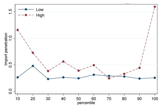 The import penetration of different productivity is shown in Figure 8, and the import penetration of each quartile group of the industry is calculated by dividing the value of imports of final goods within that group by the value of domestic sales. The figure shows that the import penetration of high-pollution industries is higher than that of low-pollution industries, and low-pollution industries show the more negligible difference of import penetration at different productivities. The import penetration of companies in the tail of the productivity distribution of high-pollution industries is higher than that of companies in the middle, which means that high-pollution industries may face higher competitive pressure in the market after the exchange-rate appreciation.