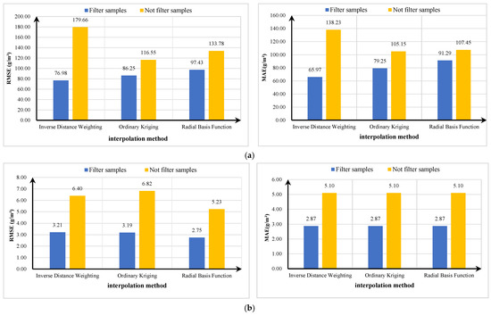The accuracy of interpolation results is affected by the redundancy and refinement of samples [22]. The above experiments used samples selected by the P-BSHADE method for interpolation. During the OK, RBF, or IDW interpolation experiments, 20% of measurement sample points were randomly selected as samples. The interpolation accuracy results are shown in Figure 2.