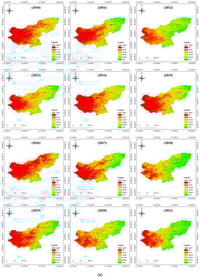 Using the best estimation model in Xilingol League and Dornogovi Province, we determined the annual grassland production for 2010–2021, with a spatial resolution of 250 m. The estimation results for each year are shown in Figure 4. The grassland production distribution in Xilingol League and Dornogovi Province for 2010–2021 showed spatial variations, with gradual decreasing trends from northeast to southwest in both regions, which was similar to the zonal distribution pattern based on the vegetation types of grasslands.