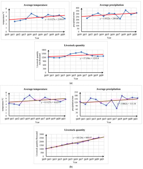 Temperature and precipitation are climatic factors with obvious horizontal distribution characteristics and are important factors that affect changes in grassland production [25]. According to the metrological data supported by Statistical Yearbook of Xilingol League and the Mongolian Statistical Information Service, the temperature in Xilingol League and Dornogovi Province showed a slow upward trend from 2010 to 2021, in line with global warming trends (Figure 6). In 2014, the temperature in both areas peaked, which may have intensified water evapotranspiration from grassland soil, regional drought, and grassland degradation [26]. This was consistent with an obvious trend of grassland reduction in the two study areas in 2014.