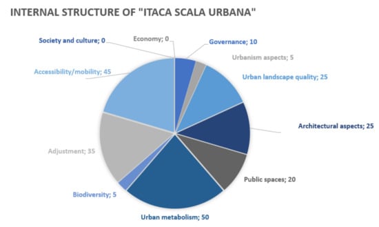 Aerogram of the internal distribution in ITACA Scala Urbana distinguished between the ten different areas. Two of them have zero parameters for this particular subject matter and application scale.