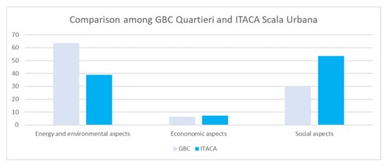 The tools were first analyzed, and three common macro-areas (energy and environmental, economic, and social aspects) were identified in order to compare the two rating systems and normalize their score; this approach can also be used to compare other building environmental assessment tools. This approach allowed us to underline the main differences and analogies among the different tools and confirm that new neighborhood protocols originated from building rating systems that dedicate little space to social aspects and the concept of inclusion. Instead, the newly developed neighborhood protocols, such as ITACA Scala Urbana, are participatory and open to social instances. The comparative analysis also suggests that ITACA could be optimized by summarizing the parameters. Indeed, last year the Institute for Transparency of Contracts and Environmental Compatibility developed a brief rating system.