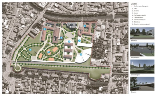 Scenario of transformation of ‘G. Prandina’ barracks. It is possible to see the new constructions (offices, oratory, museum, parking, library, cinema, and shopping centers), infrastructures, and public green areas.