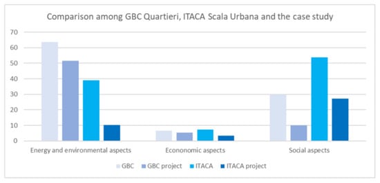 The GBC and ITACA methods for the neighborhood were compared to underline the main differences in their internal structure and to check who considers participatory social instances. Their scores are also normalized in order to compare the structure of the protocols and the results of the case study. The histogram in Figure 7 compares the rating systems and their application. The following points can be deduced: