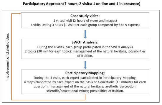 The first step was for all the experts to visit the area. A first virtual site visit was organised, showing maps, documents, photos, and videos of the study area. Subsequently, visits were conducted within the site, organised in small groups (6–9 people), following the restrictions imposed by the pandemic.