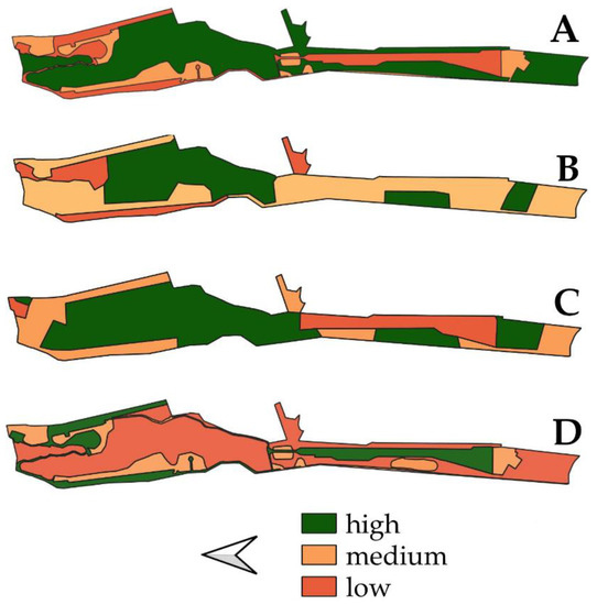 With regard to the map of the areas of the case study with different conservation levels (Figure 4A), this means the areas identified by the stakeholders as deserving protection due to their ecological and environmental characteristics and which must be specifically managed. In particular: