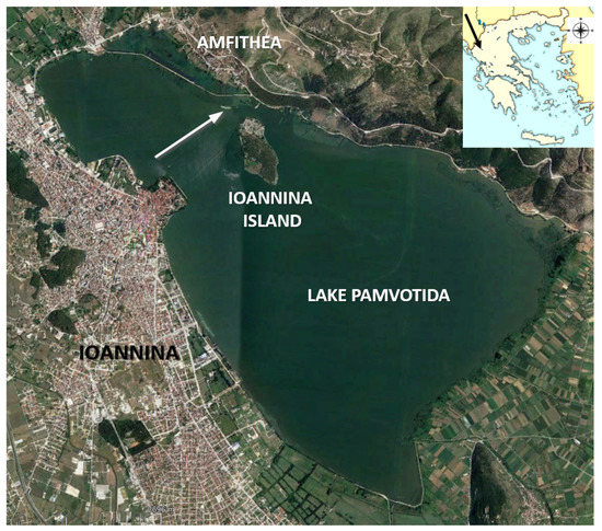Pamvotida is the largest lake of Epirus, located in the northwestern part of Greece in the Ioannina regional unit, with mount Mitsikeli located at its northwestern edge. Lake Ioannina (also known as lake Pamvotida) is a shallow lake with an average depth of 4.5 m and a polymictic stratification regime, situated at 470 m elevation, occupying an area of 22 km2 [39]. The local climate consists of cold wet winters with daily averages <0 °C and hot dry summers with temperatures in excess of 30 °C. The location of Ioannina within the Pindus mountains and the proximity of the Ionian Sea result in high levels of precipitation, with annual means of 1100–1200 mm recorded in the proximity of the lake. Annual mean evaporation and precipitation are approximately equal [40].