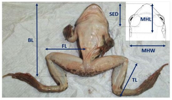 Morphometric characteristics were recorded for all 85 individuals caught (31 females and 54 males): total body weight (TW) with a digital scale (accurate to 0.1 g) and body length (BL), femur length (FL), tibia length (TL), maximum head length (MHL) from the tip of the snout to the posterior margin of the tympanum, maximum head width (MHW) the largest pre-tympanum head width [43] and snout eye distance (SED) from the tip of the head to the posterior corner of the eye, with a digital caliper (accurate to 0.01 mm) (Figure 2).
