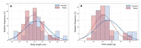 Body length (A) and total weight (B) frequency distribution of P. epeiroticus male and female populations with overlaid fitted normal distribution.