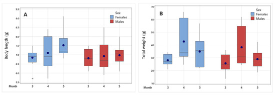 Monthly body length (A) and total weight (B) distribution of male and female P. epeiroticus populations. Values are means (dots), medians (lines), standard deviation (interquartile range box), minimal and maximal value (whiskers) and outliers (asterisks *).