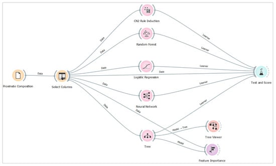 Predictive analysis was applied to identify patterns and generate predictions for sex identification based on proximate composition. Through visual programming, five supervised machine learning algorithms were utilized (CN2 induction, random forest, logistic regression, neural network and decision tree algorithms) and the one that applied best to our dataset was identified (decision tree algorithm) by scoring the performance of each model. The workflow applied for the identification of the appropriate model classifier identification is shown in Figure 5.