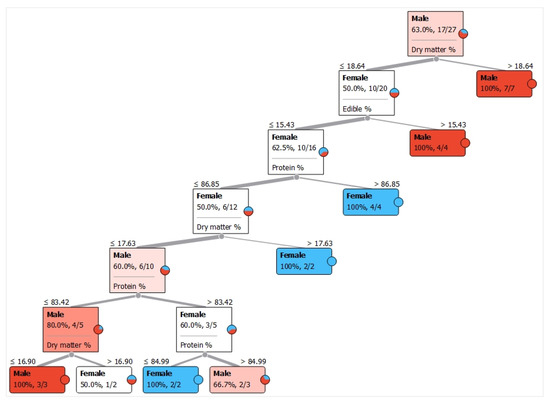 The tree classification algorithm used to compute the contribution of proximate composition to the phyletic identification of P. epeiroticus identified that the principal contributing component was the proportion of dry matter (Figure 6 and Figure 7) followed by the proportion of edible flesh and protein.