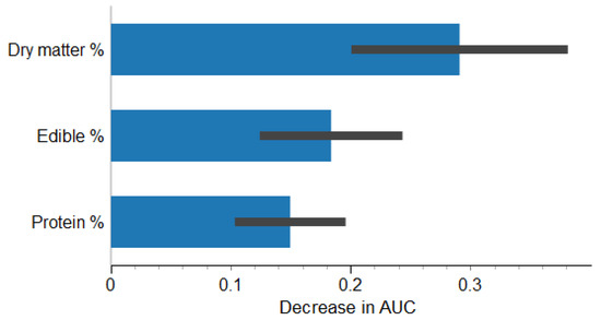 The considerable similarity was indicated in the protein content between P. epeiroticus and several fresh water fish species, notably Salvelinus fontinalis, Oreochromis niloticus, and Cyprinus carpio [54,55,56], whereas lipid content was significantly lower, indicating P. epeiroticus excellent nutritional value. Proximate composition of P. epeiroticus was used in predictive analysis aiming to identify the principal contributing proximate composition components that classify opposite sexes (Figure 3, Figure 4 and Figure 5). Predictive models are used to construct a model by using the results of the known data and predict the results of unknown data sets by using the constructed model [77].
