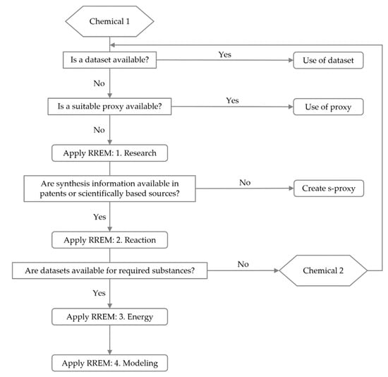 The RREM approach is applicable for chemicals when no dataset and no suitable proxy are available in databases. It enables the modeling of chemicals to fill gaps in LCI data. RREM consists of the following four steps (see Figure 1):
