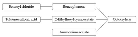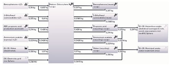 The dataset of octocrylene modeled in GaBi is shown in Figure 3. Input processes are the processes for the reactants, catalysts, solvents, and energy. The inputs benzophenone, 2-ethylhexyl cyanoacetate, and ammonium acetate are processes modeled based on RREM (see Section 2), since no LCI datasets are available. The specified outputs are reused or recycled, as described in Section 2.2. In the case of catalysts and solvents, the non-recirculated fraction is passed on to the corresponding waste processes. The same applies to the amount of the unspecified substance.
