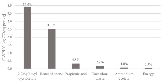 2-Ethylhexyl cyanoacetate has a GWP100 of 3.93 kg CO2eq per kg octocrylene, which originates almost entirely from its reactants. The contribution of cyclohexanol is 69%, and that of cyanoacetic acid is 30%. Thermal energy causes only 1%.
