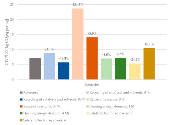 Third, the assumption on the required thermal energy is analyzed. The sensitivity analysis examines how the results change assuming 1 MJ or 4 MJ instead of 1.8 MJ thermal energy. When 1 MJ is assumed, the GWP100 of octocrylene is 0.07 kg CO2eq per kg lower than in the reference scenario (−1.0%); if 4 MJ are assumed, it is 0.18 kg CO2eq per kg higher (see Figure 6). Even when the thermal energy is doubled, the GWP100 of octocrylene only increases by 2.5%. However, the assumption on energy has a higher impact for s-proxies due to the safety factor. If 4 MJ is assumed to be the required energy, the GWP100 of toluenesulfonic acid increases by 31.3% as compared with the reference scenario. However, since only a small amount of toluenesulfonic acid is required for the synthesis of octocrylene, it has little effect on the overall result.