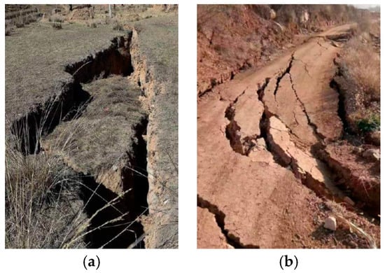 Surface disturbance and damage under the influence of mining. (a) Mountain crack; (b) mountain road slip crack.