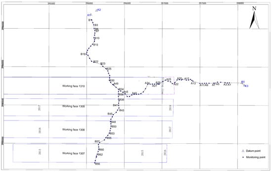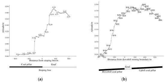 According to the terrain above the working face and the code for coal mine survey, the layout of surface movement observation stations is carried out. The observation station is arranged on the side of the stopping line. The point spacing is 30 m, and half of the strike and one dip line are arranged. The information of the observation stations is shown in Figure 3 and Table 2. A total of 49 monitoring points are arranged along the strike observation line, numbered from A1 to A49, with a total length of 1440 m. A total of 66 monitoring points are arranged on the dip observation line, numbered from B1 to B66 from the downhill direction, with a total length of 1950 m