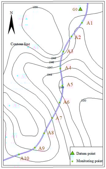 To verify the accuracy of this method, a verification experiment was carried out on a mountain road. The slope of the mountain road is about 10°. Select a distance of 50 m on the mountain road, take point G1 as the datum point and use the RTK survey data of point G1 as the datum elevation data to carry out leveling and RTK elevation survey. The spacing of experimental sampling points is 50 m and the number is A1–A10 (Figure 5).