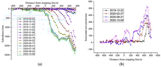 Figure 7b shows the horizontal movement of the trend line at different times. Traditionally, the horizontal movement curve should be an antisymmetric curve. It can be seen from the figure that the horizontal movement gradually increases with the advance of the working face, but it does not form an inverse symmetry.