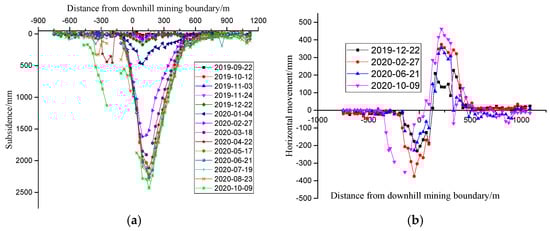 Figure 7a shows the subsidence distribution at different times in the dip direction. It can be seen from the Figure 7a that the surface subsidence value and subsidence range gradually increase with the advance of the working face, the position of the maximum subsidence point remains unchanged, near point B33. By 23 August 2020, the maximum surface subsidence will reach 2307 mm. However, due to the repeated disturbance near the old mining faces on the south sides, the dip subsidence shows the following special laws. Compared with the downhill subsidence curve, the uphill subsidence curve changes more gently and has a wider range.