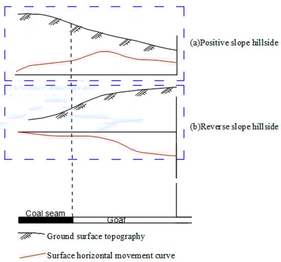 According to the spatial correspondence between working face distribution and surface topography, high relief terrain can be divided into positive slope and reverse slope. When the ground surface slope inclines to the goaf, the slope is called the positive slope, as shown in Figure 8a. On the contrary, when the ground surface slope tends to the side of the coal pillar, the slope is called reverse slope, as shown in Figure 8b.
