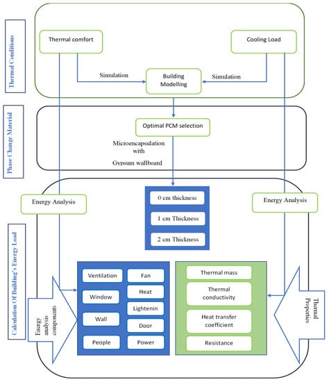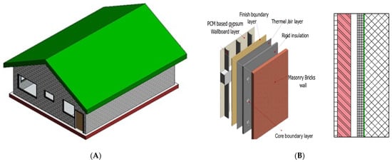 For the last three decades, the energy efficiency of buildings has been getting much attention due to the substantial energy demands of maintaining indoor thermal comfort in modern buildings [1,2]. Generally, it is critical to construct energy-efficient buildings as the increased demand for fossil fuel creates environmental problems like climate change and an increase in the cost of fossil materials [3]. Previously, buildings were constructed with wider walls that could store a large amount of sensible heat and provide natural conditioning by controlling the temperature variations [4]. However, in modern buildings, the wall’s thermal mass has been reduced to save materials, time and transportation [5]. Ultimately, the lightweight buildings are getting huge temperature variations because of this new development, which leads to low thermal storage and extreme internal cooling and heating loads [6,7]. Therefore, it is crucial to design and implement efficient energy-saving techniques in buildings. Building envelopes such as walls, roofs, windows and floors isolate the indoor environment from the outside weather conditions to maintain indoor thermal comfort [8]. Therefore, building envelopes present an opportunity to enhance indoor thermal comfort and reduce energy consumption by influencing the heating and cooling loads of a building [9]. Many steps have been taken by Heat, ventilation and air condition (HVAC) engineers, such as incorporating facades, hydronic systems, thermal conditioning by radiation, thermal storage devices and many more to reduce energy consumption in buildings [10]. To ensure the thermal comfort of a building, it is evident that cooling and heating loads will be affected, but recent development in construction materials has changed this phenomenon with the significant use of phase change materials (PCM) [11,12].