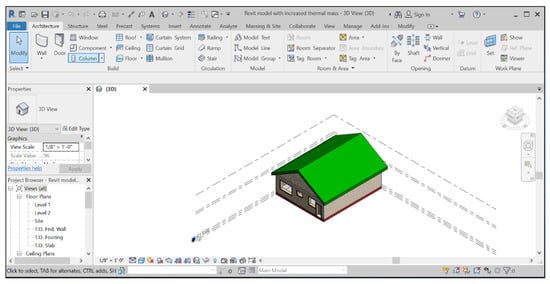Revit 2021 software was used to structure a 3D model (Figure 5) of a building located at Wagaman suburb (GPS—12.3810040, 130.8805245) in Darwin, Australia. The 3D model in Revit usually represents 3D geometry as rectangles, lines, and extrusion operations between the geometry [56]. Depending on its purpose, the focus moves textured or shaded surfaces to volumes of building envelopes for calculations. With Revit, a building’s 3D model’s different sections and view can be seen straightforward from the wire-frame display. The Revit software was chosen because of its numerous advantages such as visualization, user-friendly, relative ease of understanding, showing depth elevation clearly and visually, and having the flexibility of design changes [56]. It helps to minimize the field clashes and delay in construction projects as resolution occurs before any work is done.