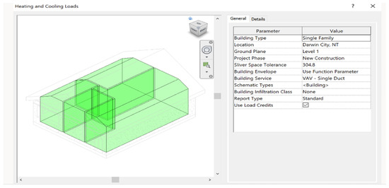 To analyse the energy consumption for the selected residential building, Revit gave an option to specify the project’s geographic location, weather, and site. In addition, the selection of Darwin, NT gave cooling design temperature data for all months of the year, as shown in Table 4. Since the location, weather and site data were provided, the 3D structure was converted into the energy analytical model to calculate the yearly energy consumption of the building. This feature allowed inspection of the energy analytical model to validate it before running the energy simulation. The energy analytical model was based on conceptual masses, building elements, or both depending on the analysis mode selected in the energy setting dialogue.
