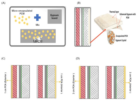 (A) Formation of microencapsulation based PCM. (B) Composite wall Microencapsulated PCM layer. (C) PCM-based gypsum wallboard with 1-centimetre thickness impregnated at exterior and interior side of the composite wall. (D) PCM-based gypsum wallboard with 2-centimetre-thickness impregnated at exterior and interior side of the composite wall.