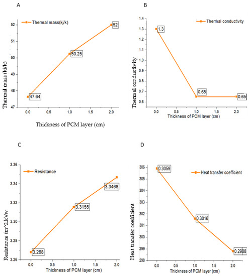 The thermal resistance of the wallboard increased with the increase in the thickness of the PCM layer. The higher thermal resistance of walls material was considered to restrict heat transfer. Furthermore, due to the higher thermal resistance of PCM, heat transfer was lower towards the inside surface. This phenomenon indicated that the lesser the heat transfer to the indoor, the lesser cooling load would be required to maintain the thermal comfort. Additionally, the heat transfer coefficient decreased with an increase in PCM wallboard thickness. As mentioned in the introduction section, heat transfer through the wall of resistance is the reciprocal of heat transfer coefficient (U = 1/R), where R is the total resistance of the material used in constructing the walls. Therefore, the higher the R-value, the higher the insulating value of the material or the lower the U-value, the higher the insulation value of the material [32]. Hence, decreased value of the heat transfer coefficient gave higher insulation and less heat transfer to the indoor space.