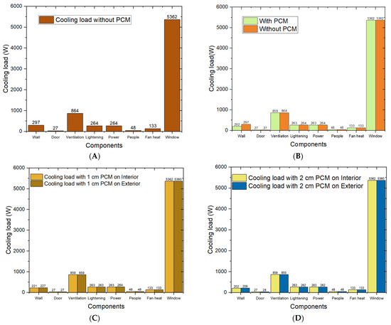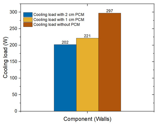 Overall, the cooling load of the building with and without PCM was calculated and the total cooling load without PCM was 7259 W, whereas with PCM (1-centimetre and 2-centimetre-thicknesses), the total cooling load was 7151 W; this gave a 1.49% reduction in total cooling load. This decreased cooling load is due to the PCM-based gypsum wallboard that stored thermal heat due to the phase change mechanism. This slight cooling load percentage reduction could be increased by increasing the quantity of PCM during encapsulation, but the PCM that can be used is limited by the structural integrity of the gypsum board [58]. In addition, Darwin has a similar temperature during the day and night, thus restricting the PCM’s ability to give an optimal performance [59].