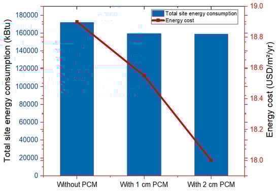 The total cooling load of the building decreased by increasing the thickness of the PCM-based gypsum wallboard. For example, the total cooling load decreased by 1.1% when 1 cm in thickness was applied to the wall, whereas a 1.5% reduction was obtained when 2 cm of PCM layer was applied. Therefore, a lower amount of energy to transfer indoors with increased thickness [64]. The highest reduction in total cooling load was obtained when PCM gypsum wallboard was installed at the internal linings of the walls and successful in capturing solar energy, which helps in performing the phase-change mechanism [58]. The total site energy and energy cost both decreased with increasing the PCM layer’s thickness. Moreover, a 2-centimetre-thick PCM layer gave a 7.6% reduction in total site energy, and 4.76% energy saving in USD/m2/year was achieved.