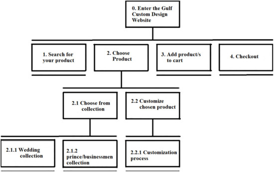 The primary user is the owner of the brand, who adds the products and the options to customize the product. The second category of the owner is the customer, who can further be categorized into unregistered visitors, uncategorized customers, businesspeople, or wedding purposes. These categories facilitate the admin to determine the advertising strategies and form an interface targeting each customer to provide a more convenient user experience.