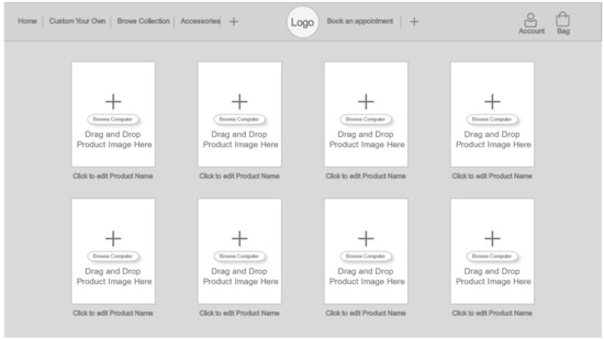 The primary addition is the customization page on the present website, which only offers clothes in regular categories. Therefore, the focus is on the customization of the page, which is user-friendly, i.e., easy to use and accessible irrespective of time. Two prototypes were prepared; one was controlled by the admin (as defined earlier) and the user. Figure 7, Figure 8 and Figure 9 provide a general overview, where the admin adds, organizes, and customizes the products.
