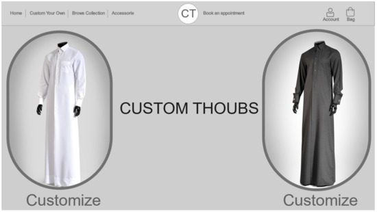 The tools were implemented on the gown (Bisht/meshlah) project idea, an elite category product that is believed to benefit the market as a whole. The customization ability of the website helps in competing in the market, where every service advertises numerous images. Once the homepage is loaded, a picture of the offered product is displayed, where various products are displayed. This provides hints to users about offers of customized products, where the option for product customization, in GIF, is also shown.